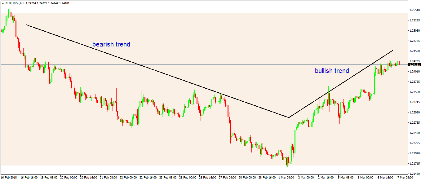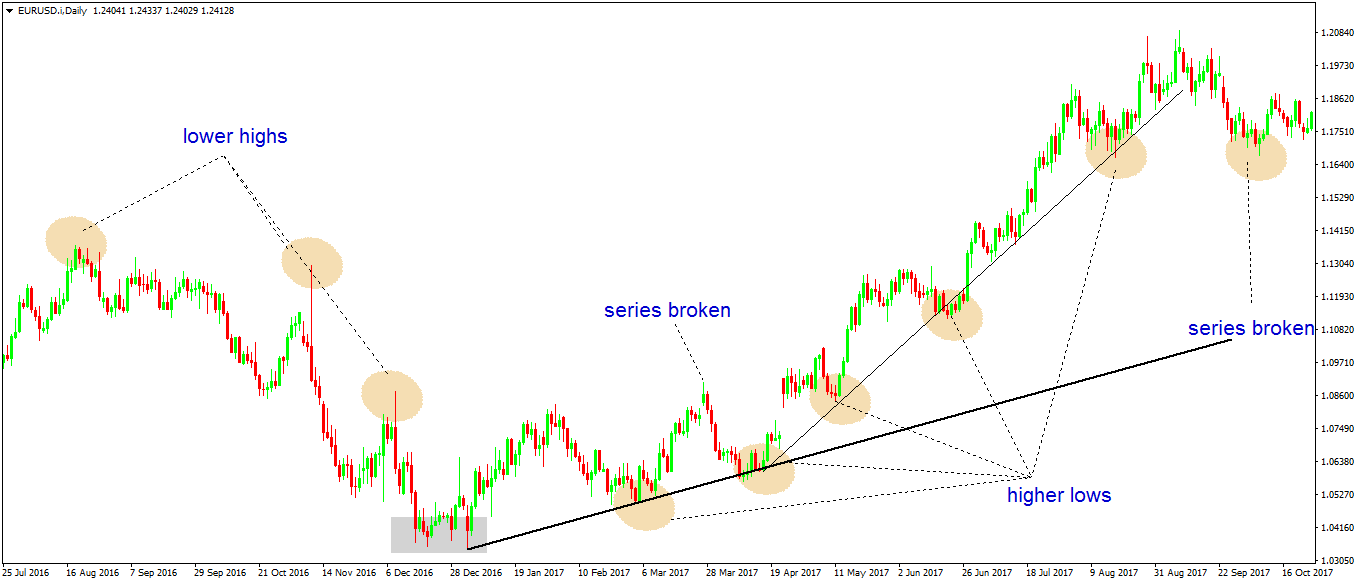 The difference between the series explained earlier, and a trend line is that the last one is more visible. Traders effectively see if the price stays below or above it, and act accordingly.