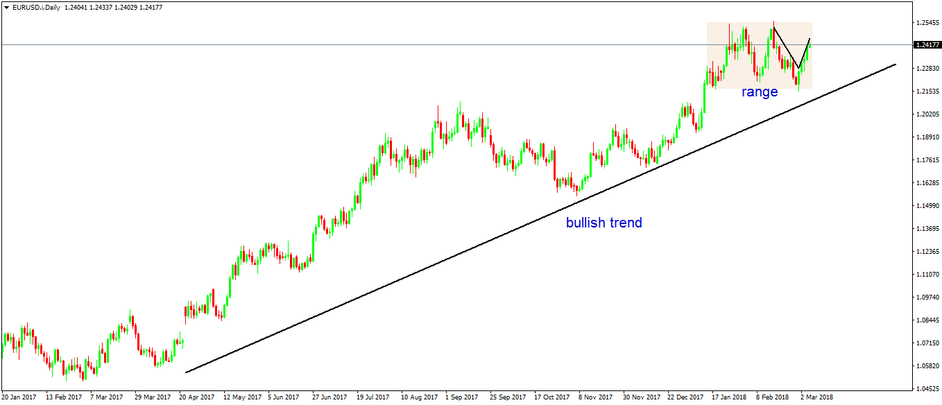 As you can see, the daily EURUSD is in a massive bullish trend that started in the spring of 2017. The current range that we analyzed on the four-hour time frame is nothing but a range or a consolidation.