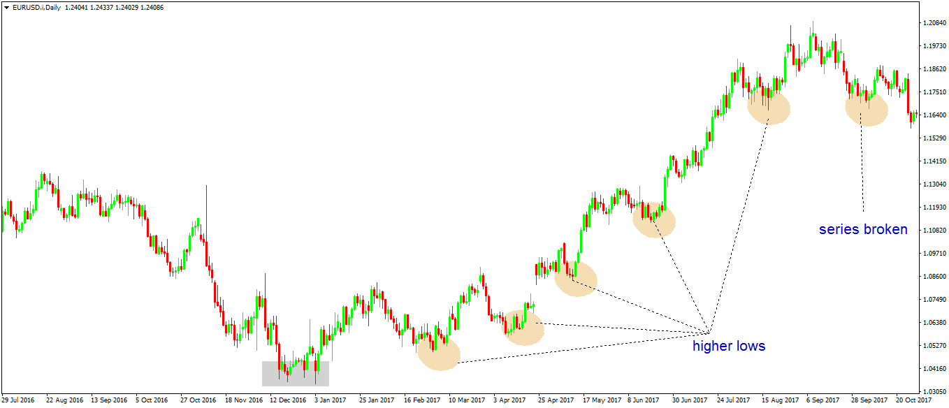 • The market forms a series of higher lows. If the price is not able to break the series, the trend remains in place. Hence, traders will buy dips, to add to the current position or to find a good entry to join the ride.