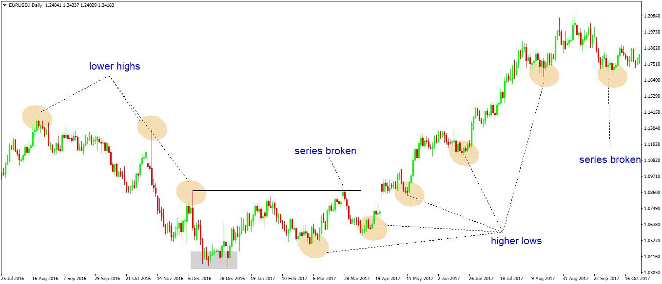 What makes a trend, though? The answer comes from the sequence in the price action, also called the higher lows and lower highs sequence.