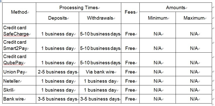 FXDD has different payment methods including credit cards, bank's wire, and other electronic options. All redeemed funds will be returned the way the money was received. There are no fees, neither minimum amounts. FXDD accepts deposits in USD, EUR, GBP, JPY , CHF and BTC. Paper checks are not permitted. FXDD covers the costs of the first withdrawal per client each calendar month.